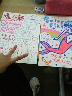 みんながテストを答えと照らし合わせ 採点ミスを探す中 黙々と水泳ポスター製作する。アタクシ+Tちゃん(笑。 手はTちゃんです。(笑。 更にこの後はギラギラしたりキャピキャピしたりした!! それから水泳部のみんなでTシャツのデザインしたりしたよ。 多分ビキニ&ハート柄のキリンさそを右側 左にでっかい唇で口の中にSWIMMING CLUB ってなる! はじめはユニコーンがビキニくわえたりして 相当変態臭くなった(笑。 みんなはじめからビキニっていうのは捨ててないし。(笑。 水泳部員中2悪い方向に絵上手いからみんな。(笑。 やっぱり大人数で絵描いてると 確実にカオスになりますな!!! いや、カオスいいと思うけど。 THE混沌! とんてんしゃらりんのぽん。